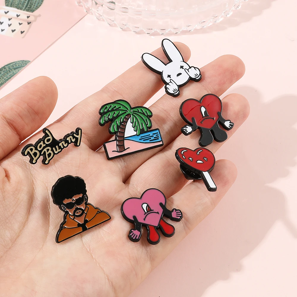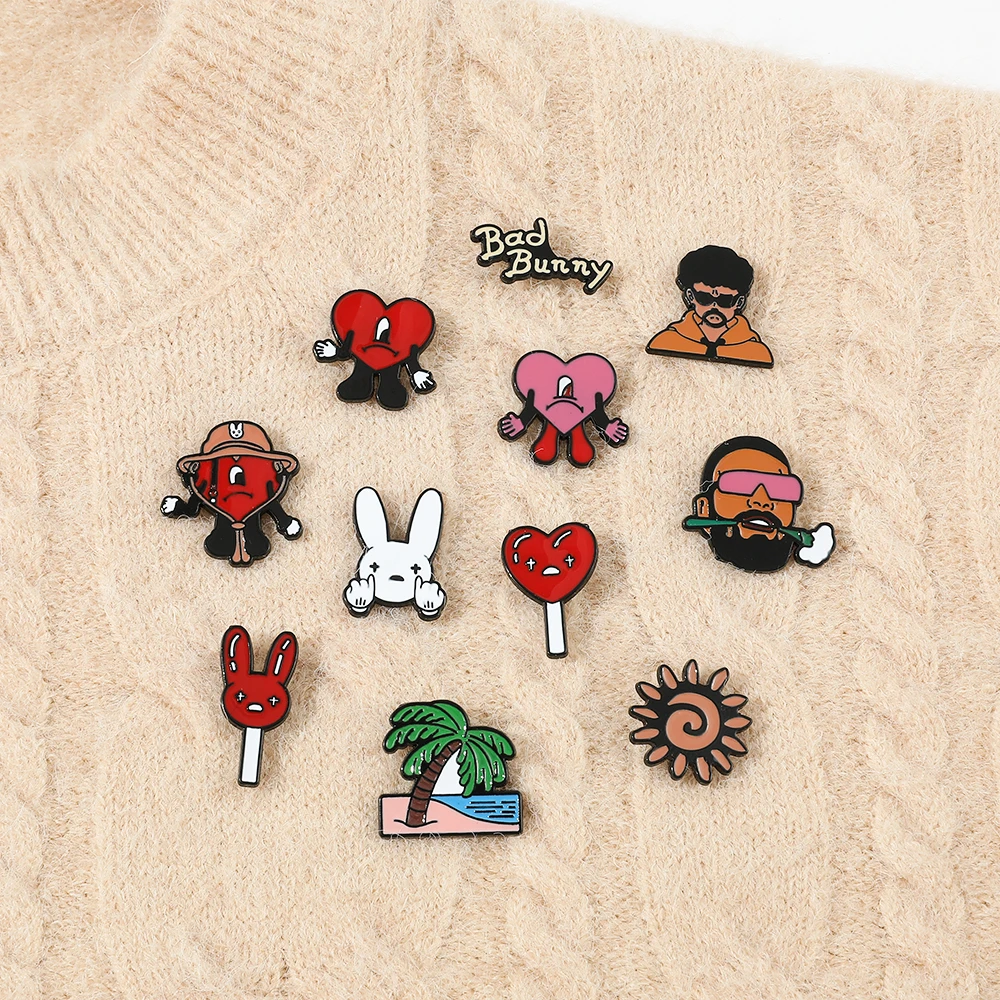 Bad Bunny Metal Enamel Brooch Rapper Bad Rabbit Red Heart Lapel Pins for Backpac