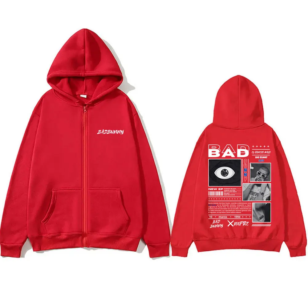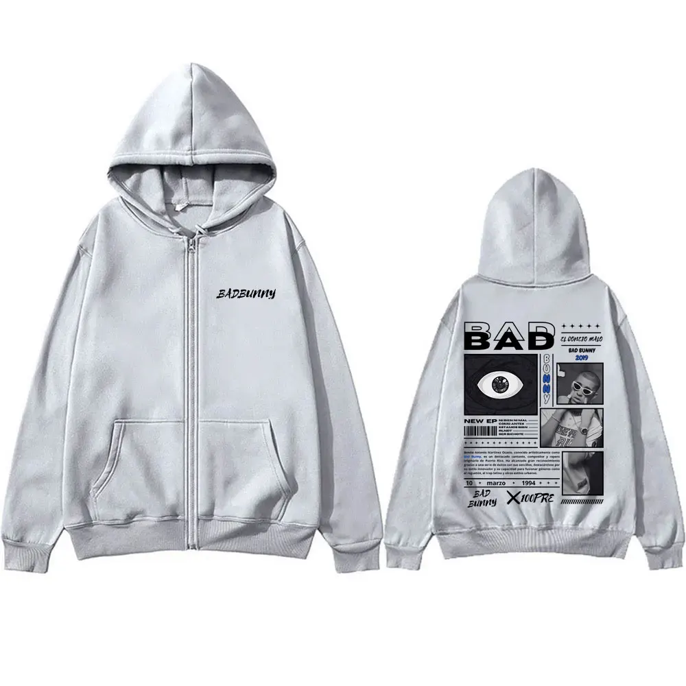 Rapper Bad Bunny X 100per Album Print Zipper Hoodie Men Women Vintage Hip Hop Zi